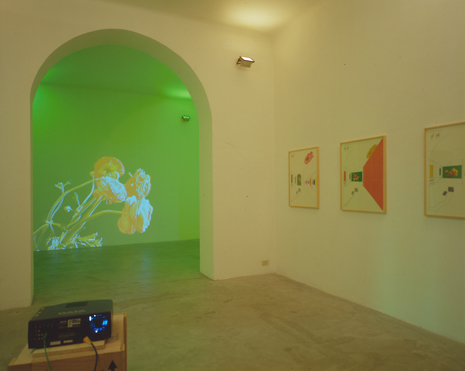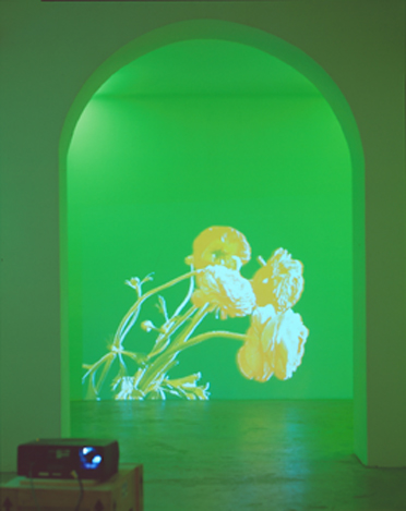 Bastard Pink, 2002One (1) video projector, one (1) DVD player, one (1) DVD, Lee Filters, existing architectureInstallation view, Galleria Emi Fontana, Milano, 2002