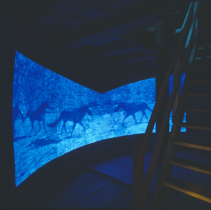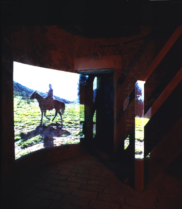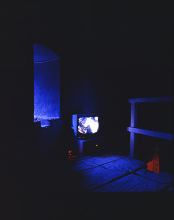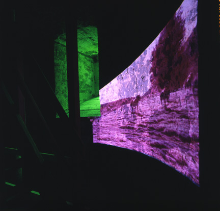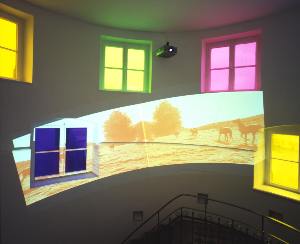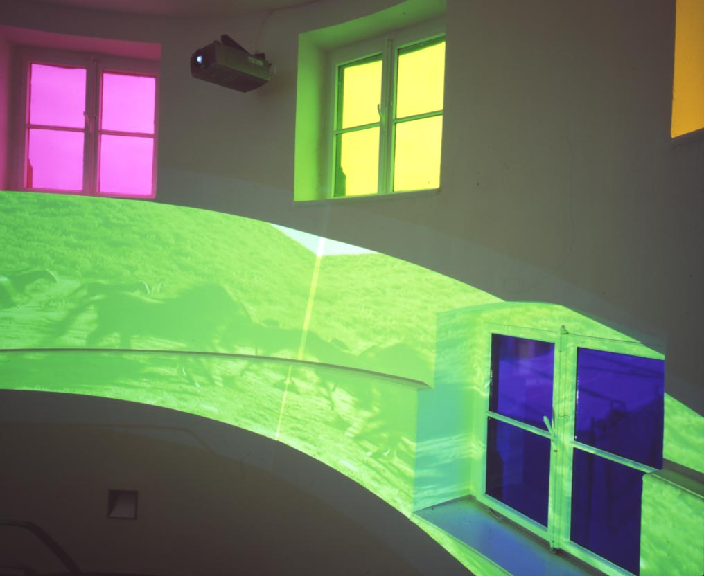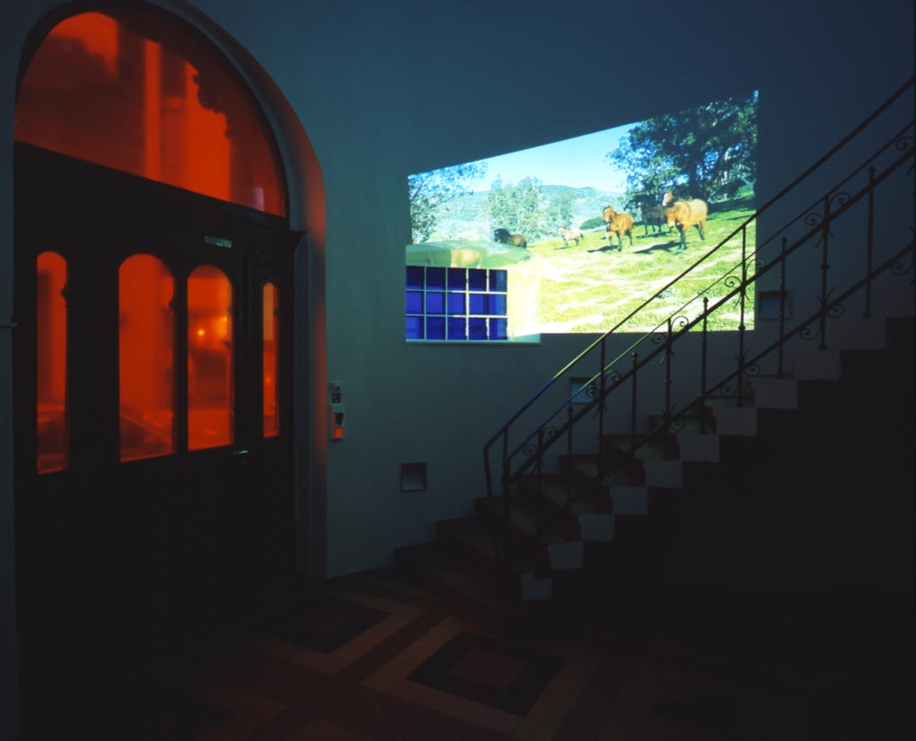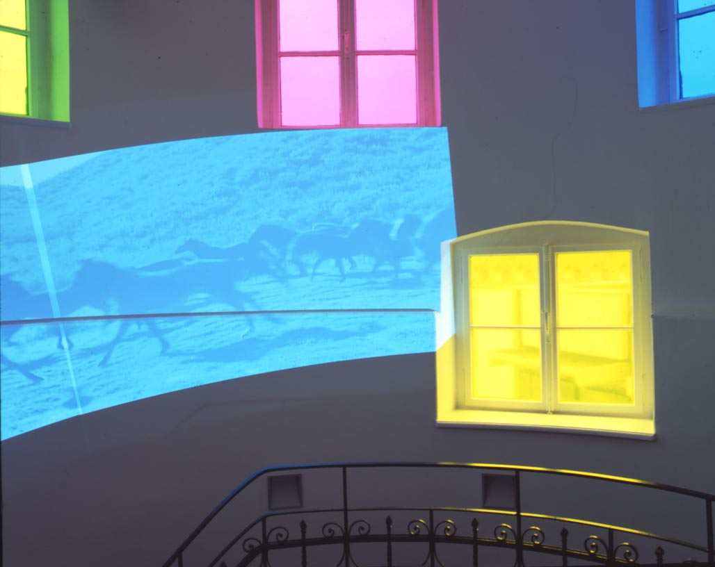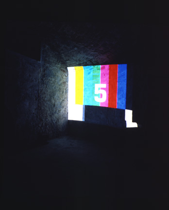 Broken Circle, 1997Six (6) video projectors, one (1) Video monitor, six (6) DVDs, six (6) DVD players, one (1) synchronizer and Lee FiltersDimensions variableExterior view, Museum Fur Gegenwartskunst, Siegen, 2001 - 2005