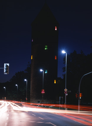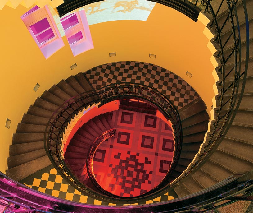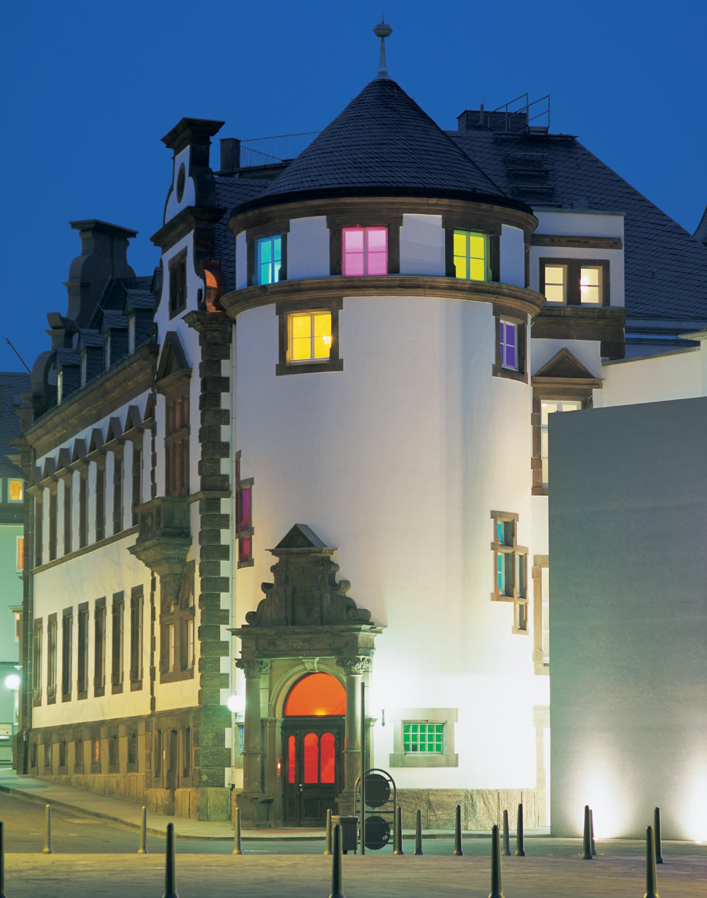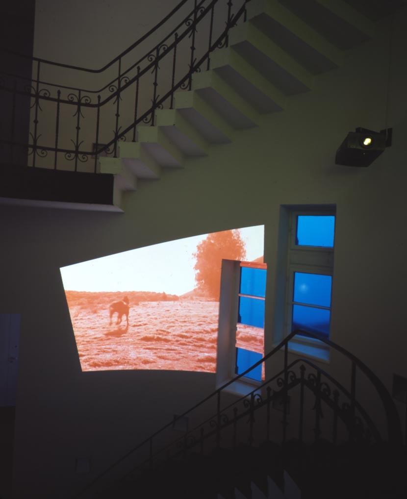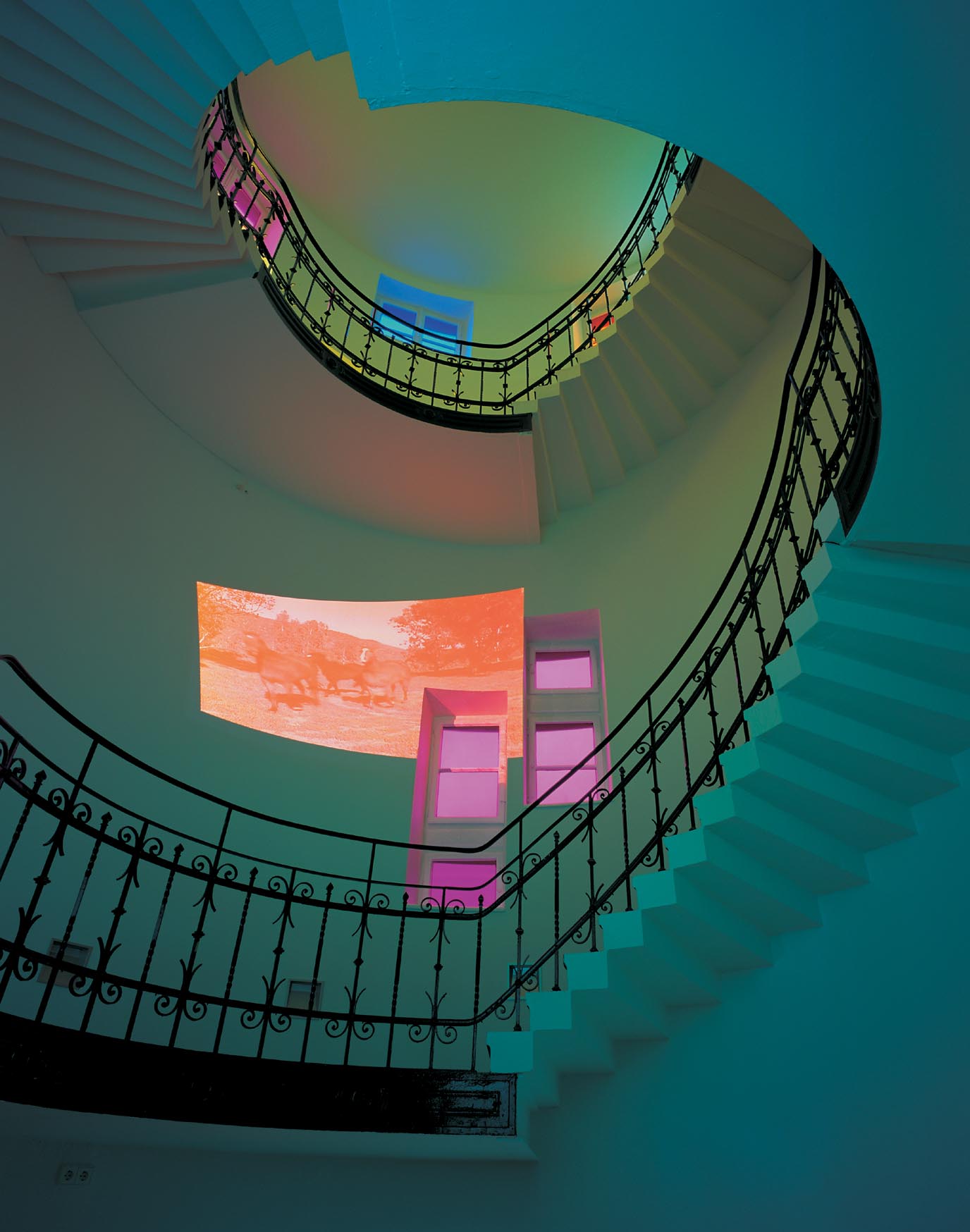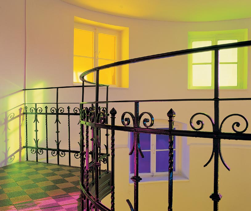 Broken Circle, 1997Six (6) video projectors, one (1) Video monitor, six (6) DVDs, six (6) DVD players, one (1) synchronizer and Lee FiltersDimensions variableExterior view, Museum Fur Gegenwartskunst, Siegen, 2001 - 2005