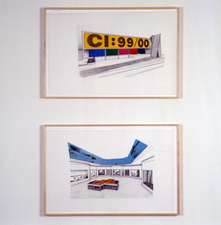 Delphine Drawing for Carnegie International, Diptych #1, 1999Mylar with ink, graphite, pantone film and ink jet prints