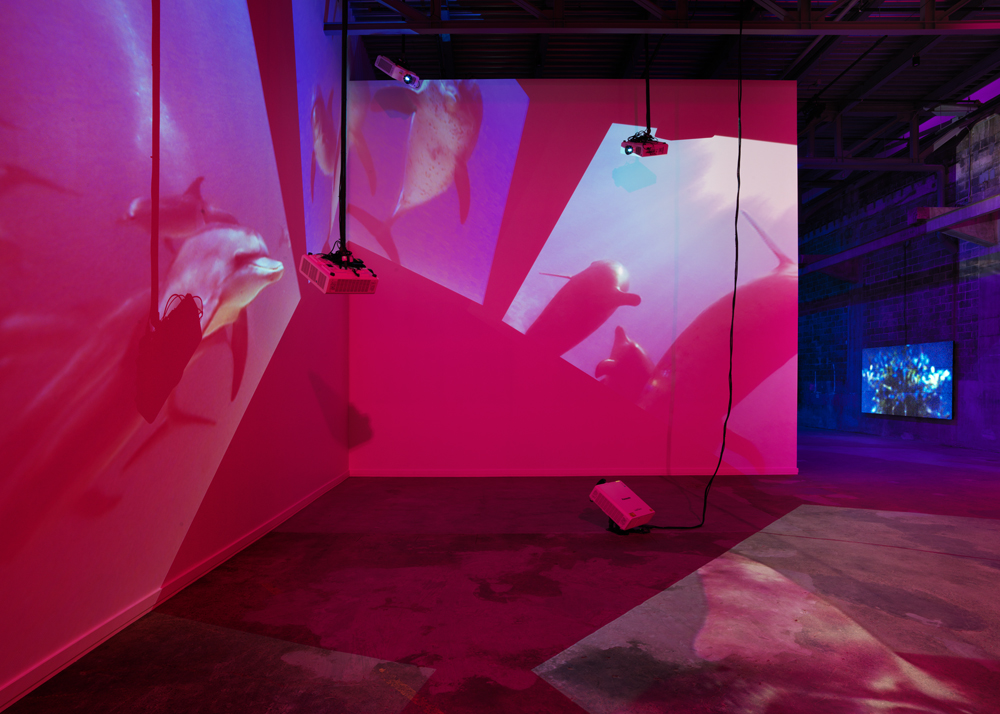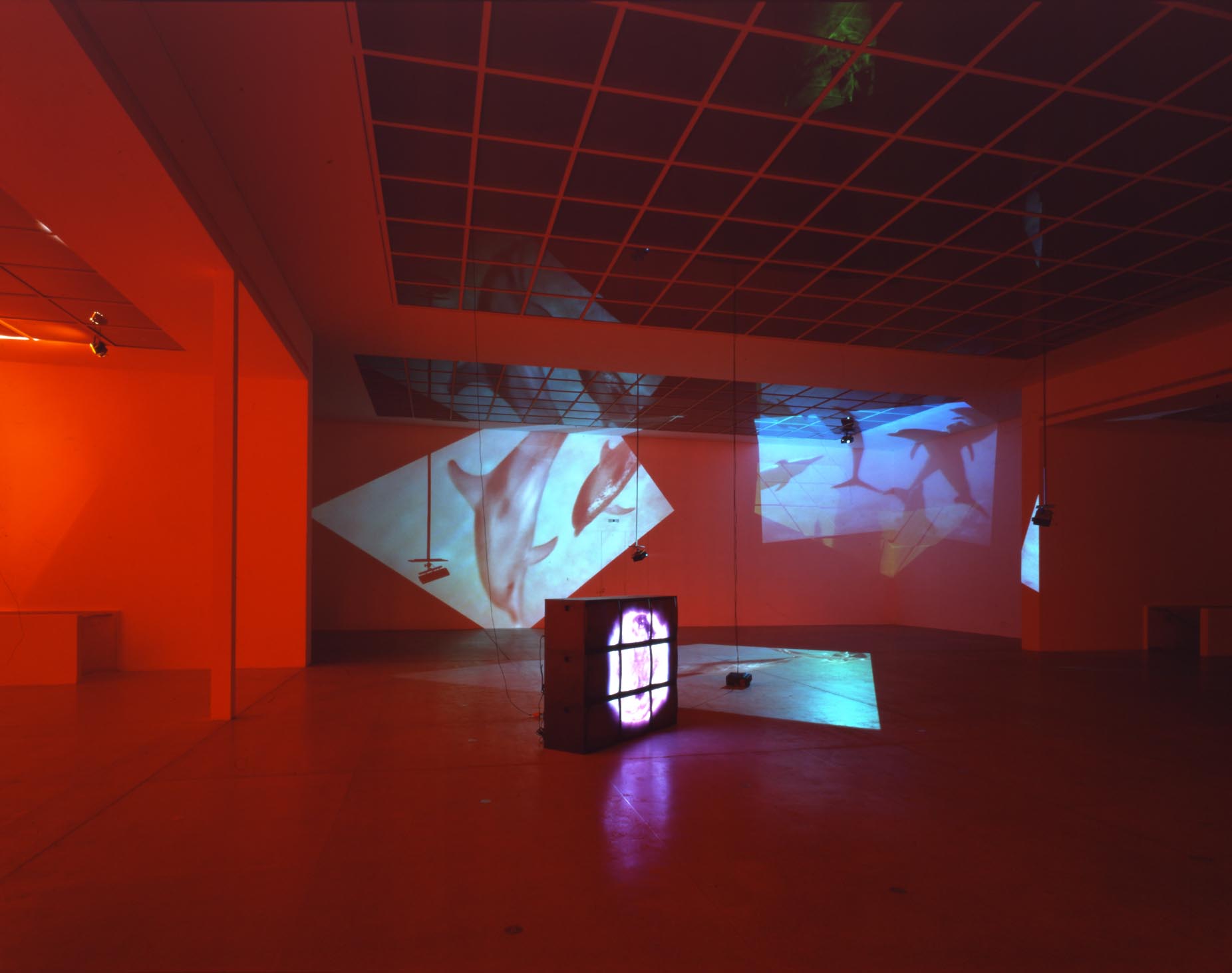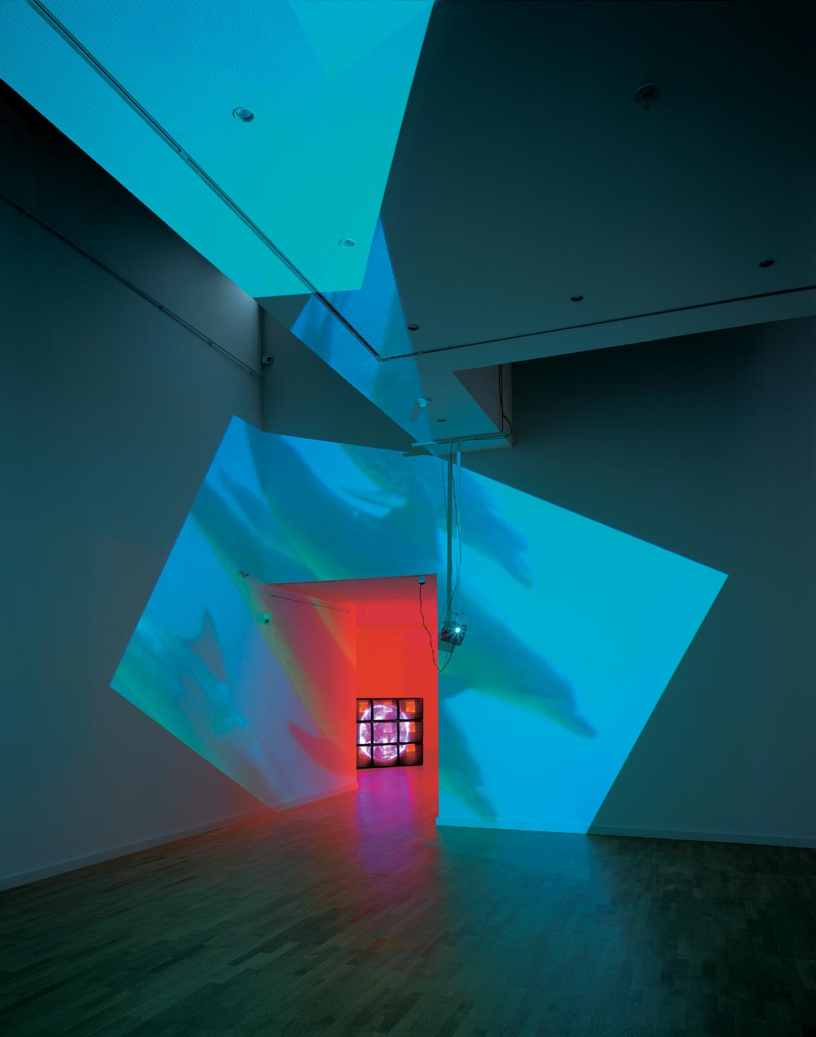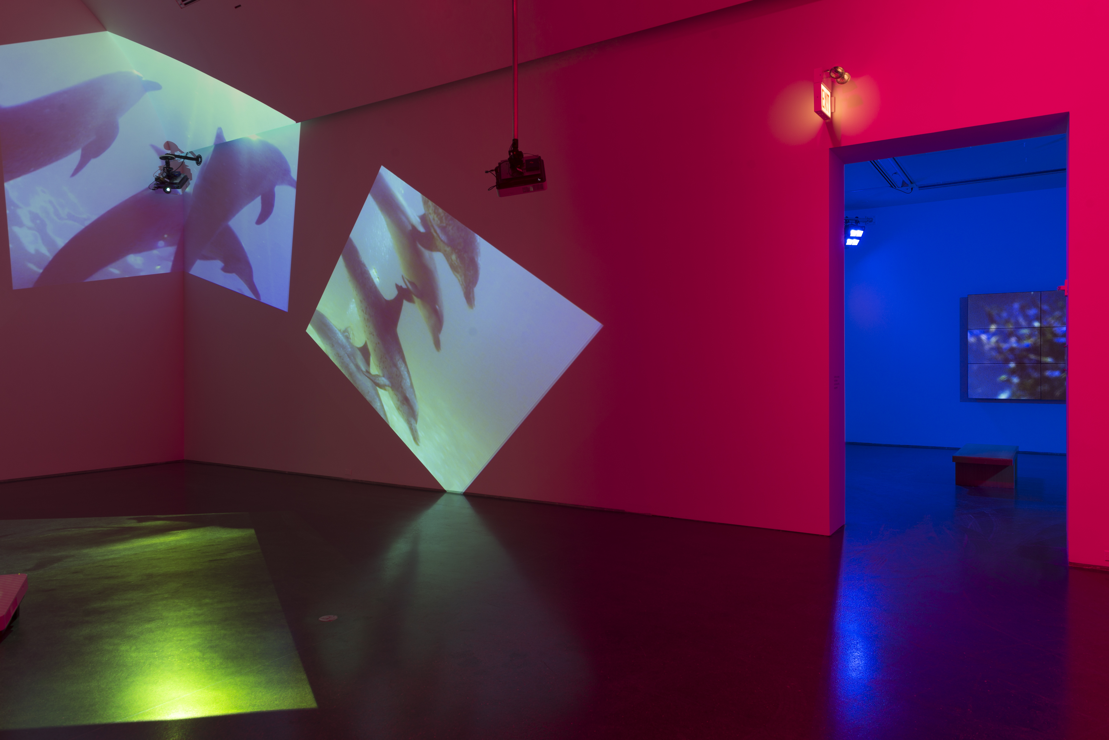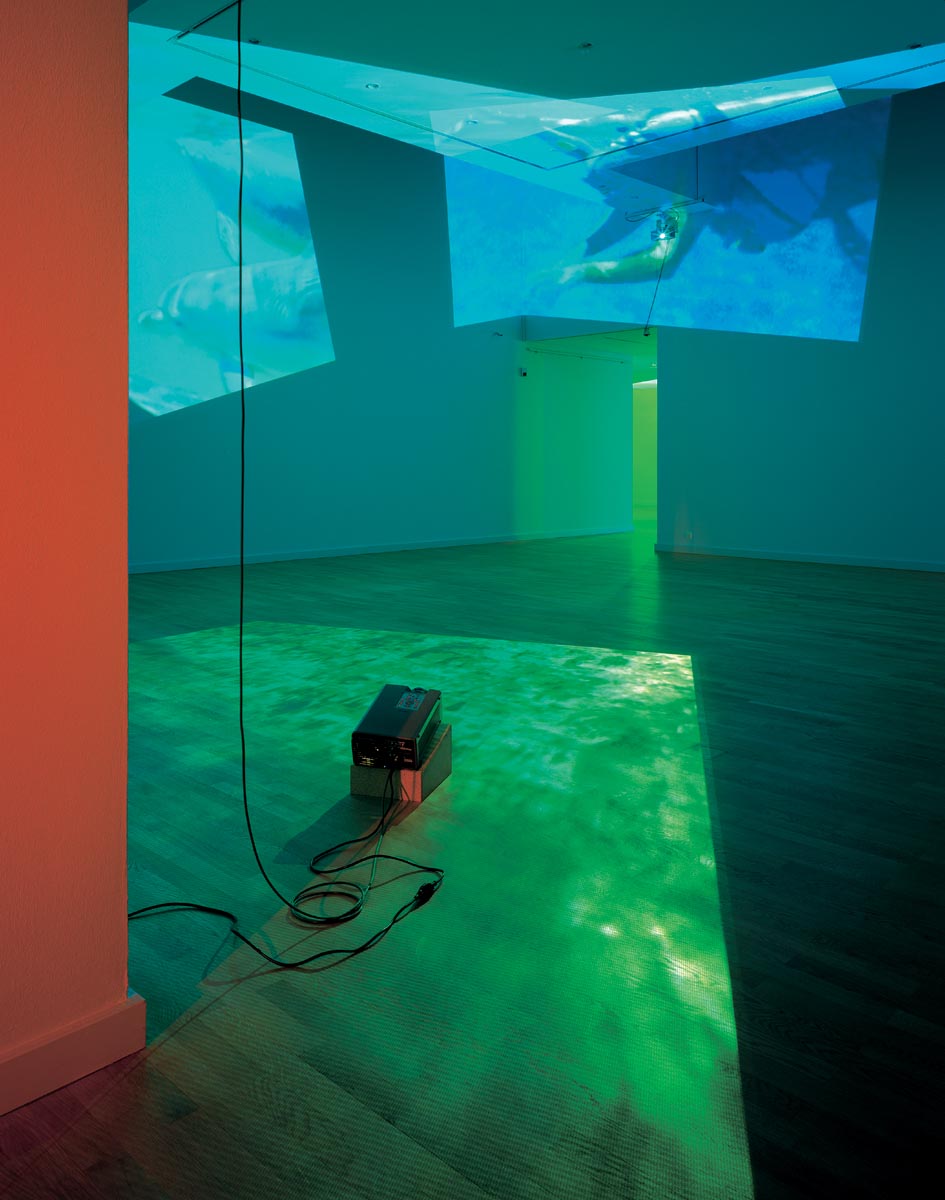 Delphine, 1999 Four (4) video projectors, five (5) media players, nine (9) Video monitors, Lee filters and existing architecture Dimensions Variable Installation view, Los Angeles County Museum of Art, Los Angeles, California, 2015 Photo by Fredrik Nilsen