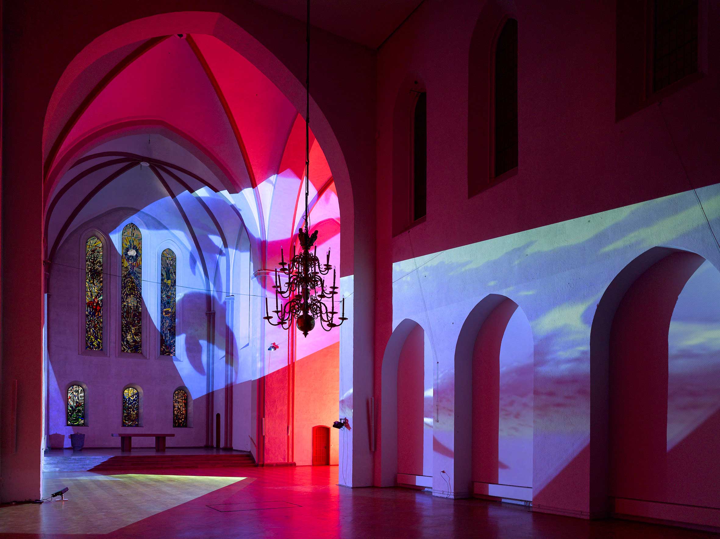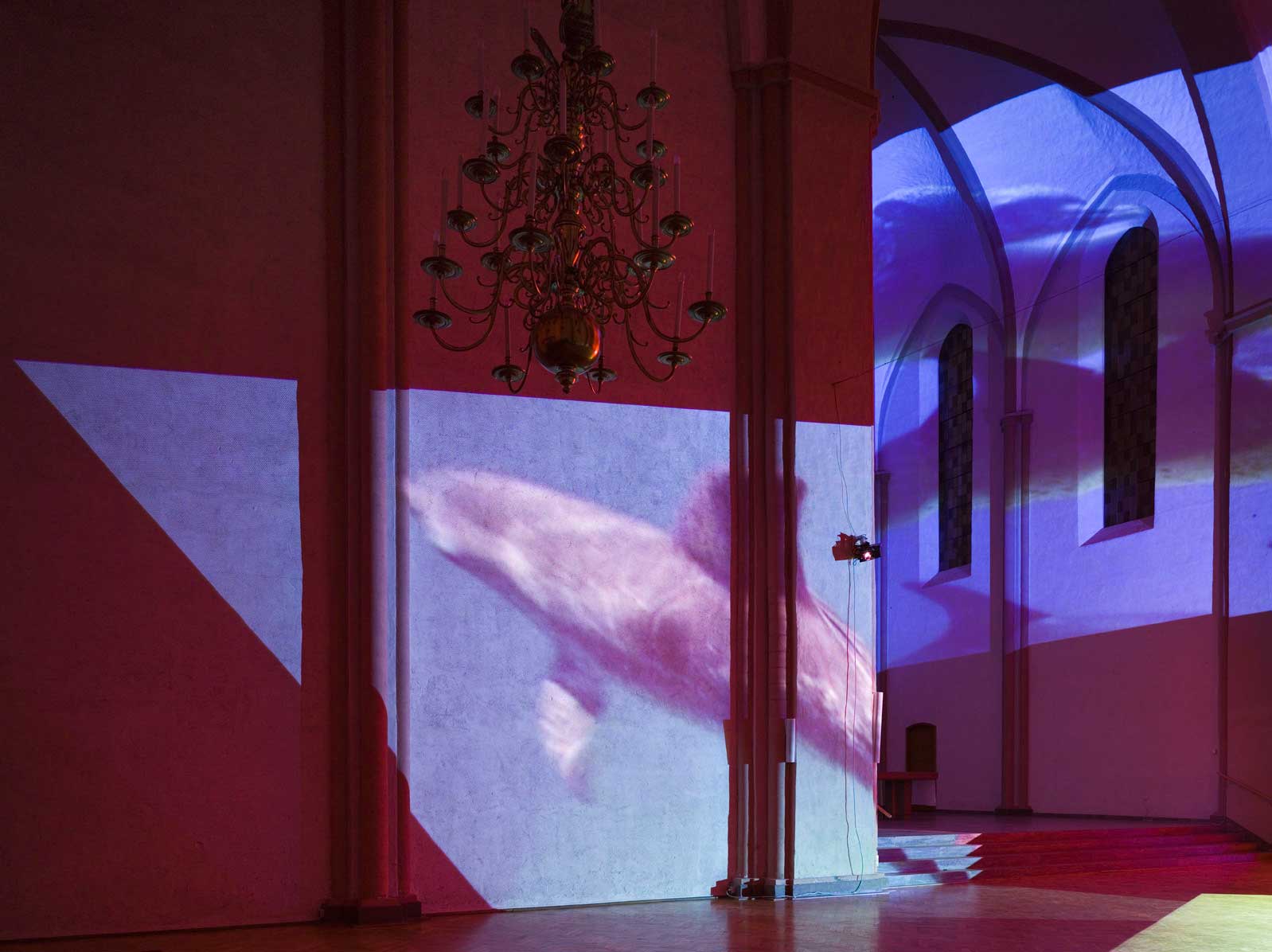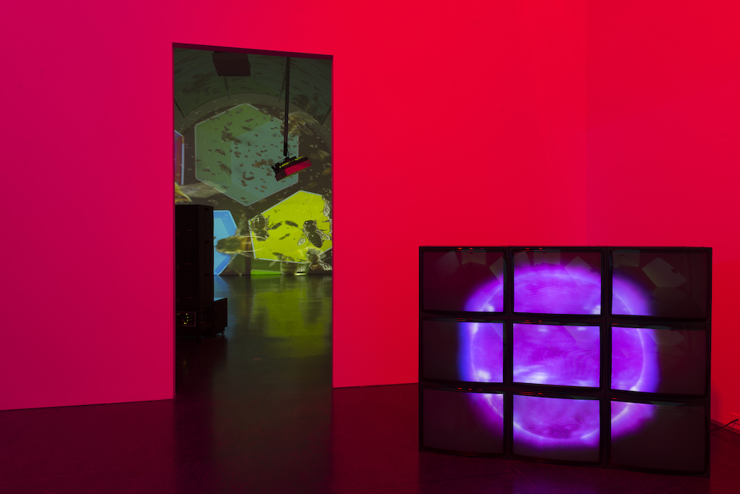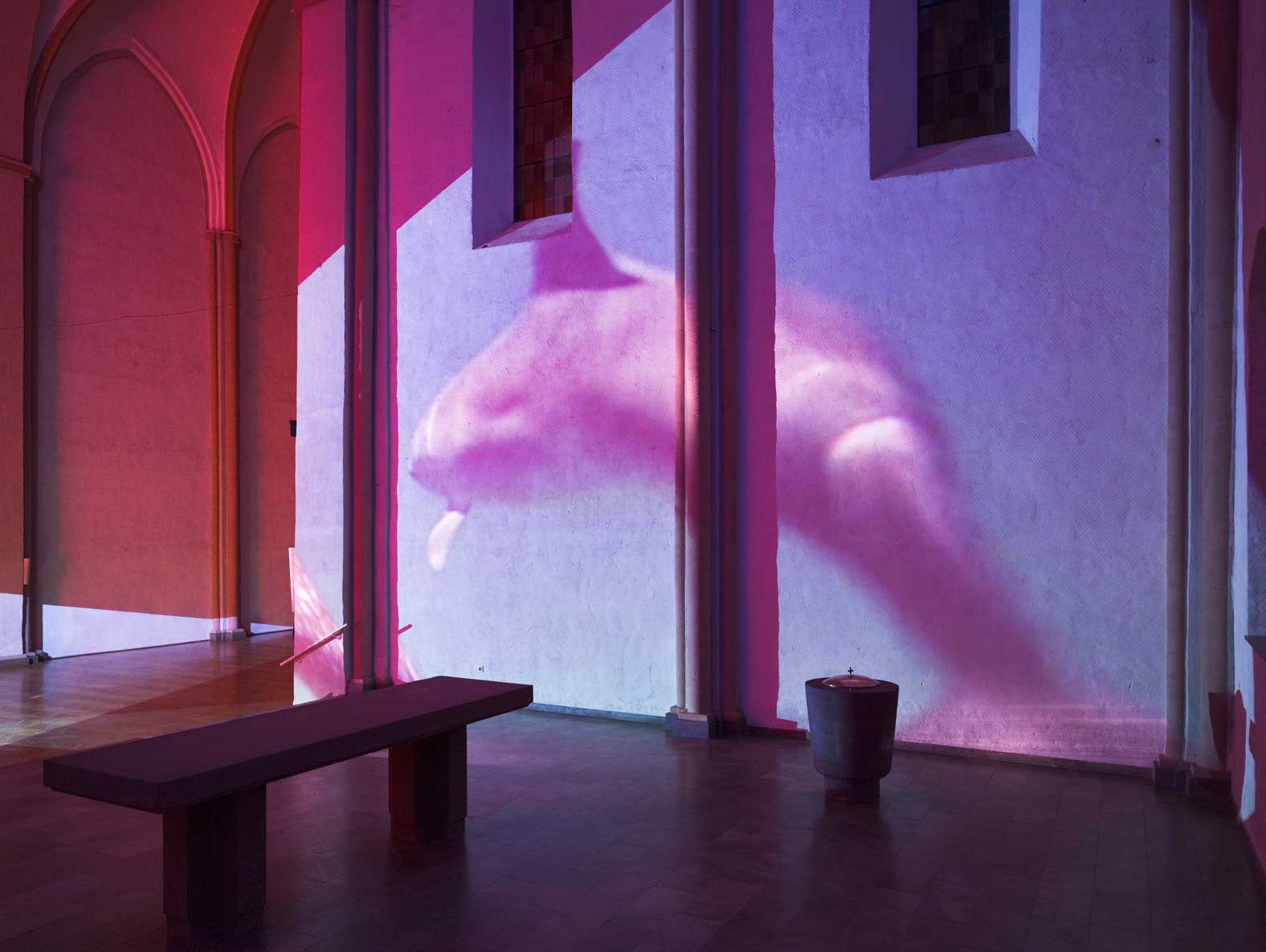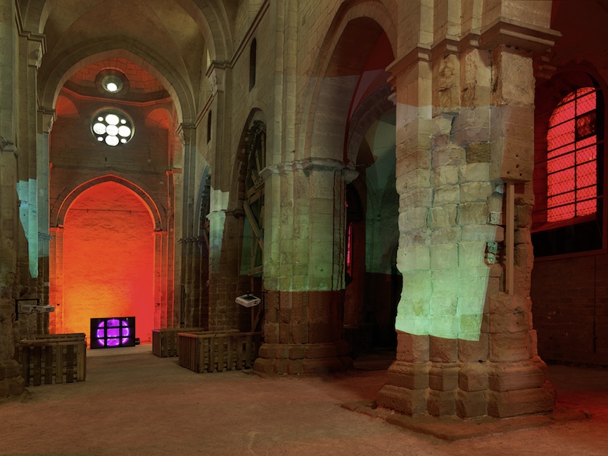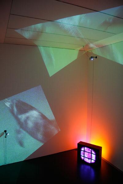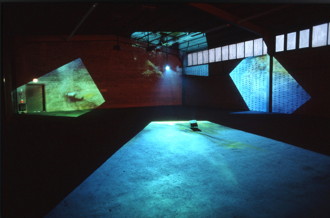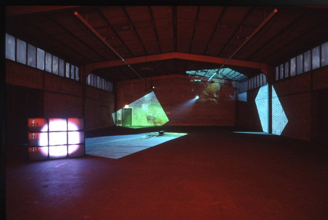 Delphine, 1999 Four (4) video projectors, five (5) media players, nine (9) Video monitors, Lee filters and existing architecture Dimensions Variable Installation view, Los Angeles County Museum of Art, Los Angeles, California, 2015 Photo by Fredrik Nilsen