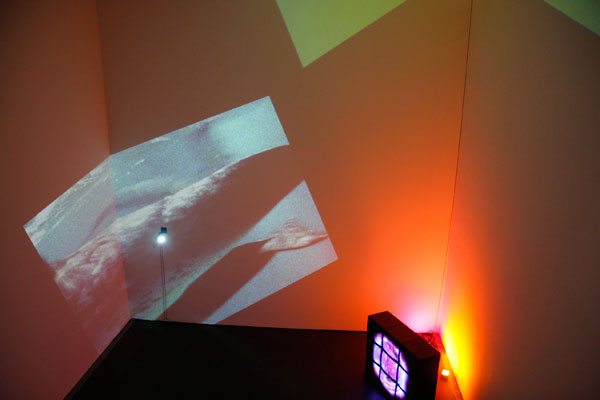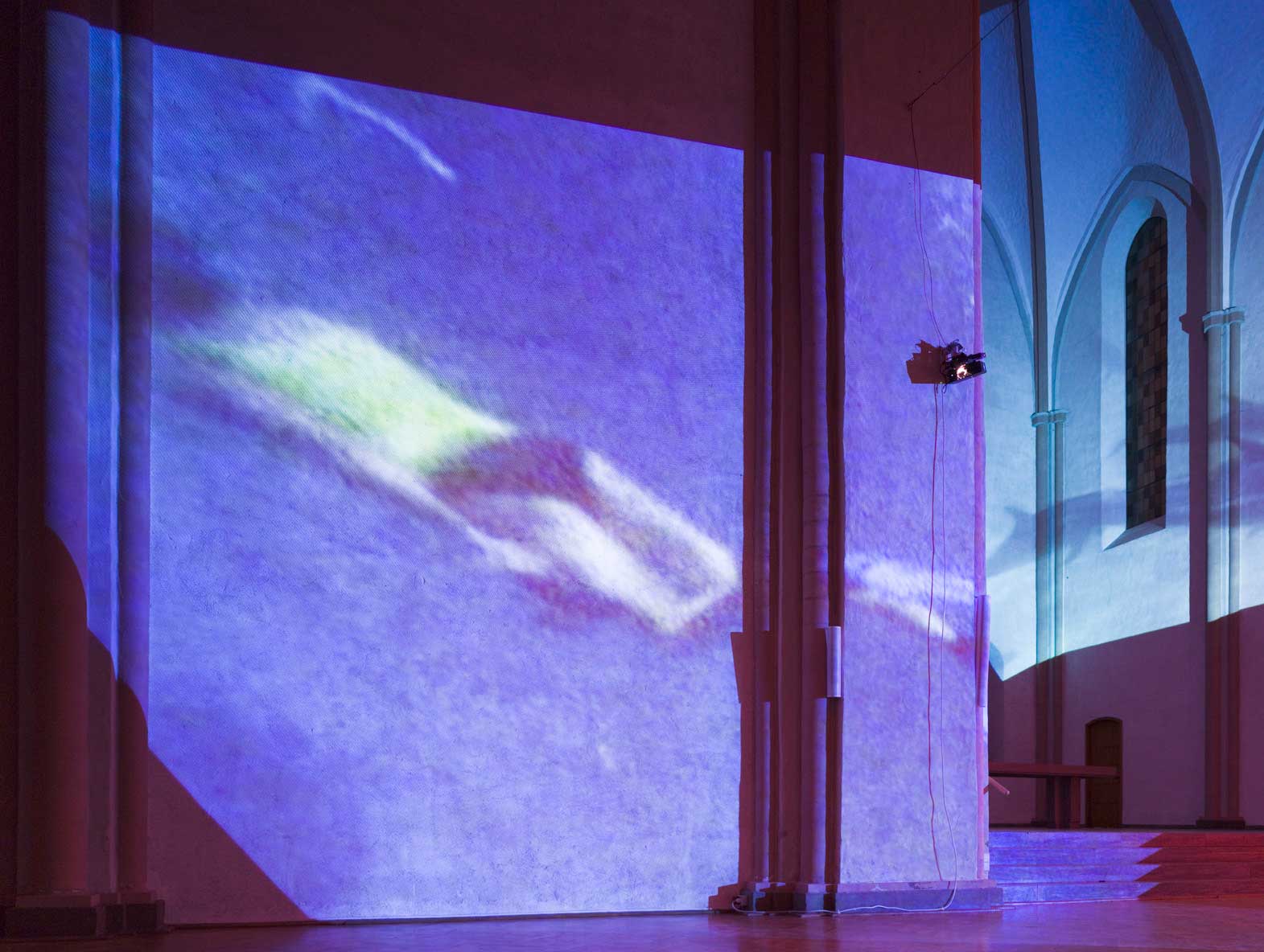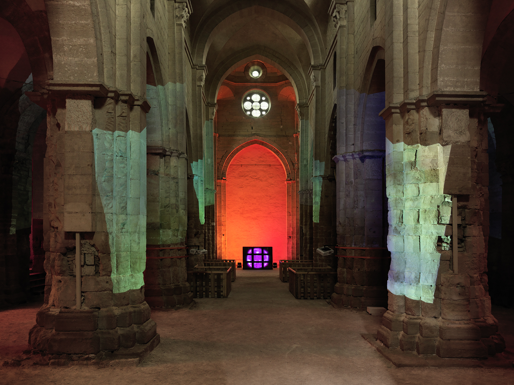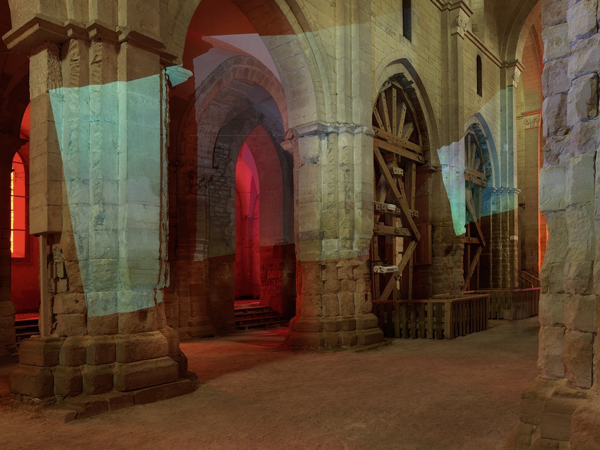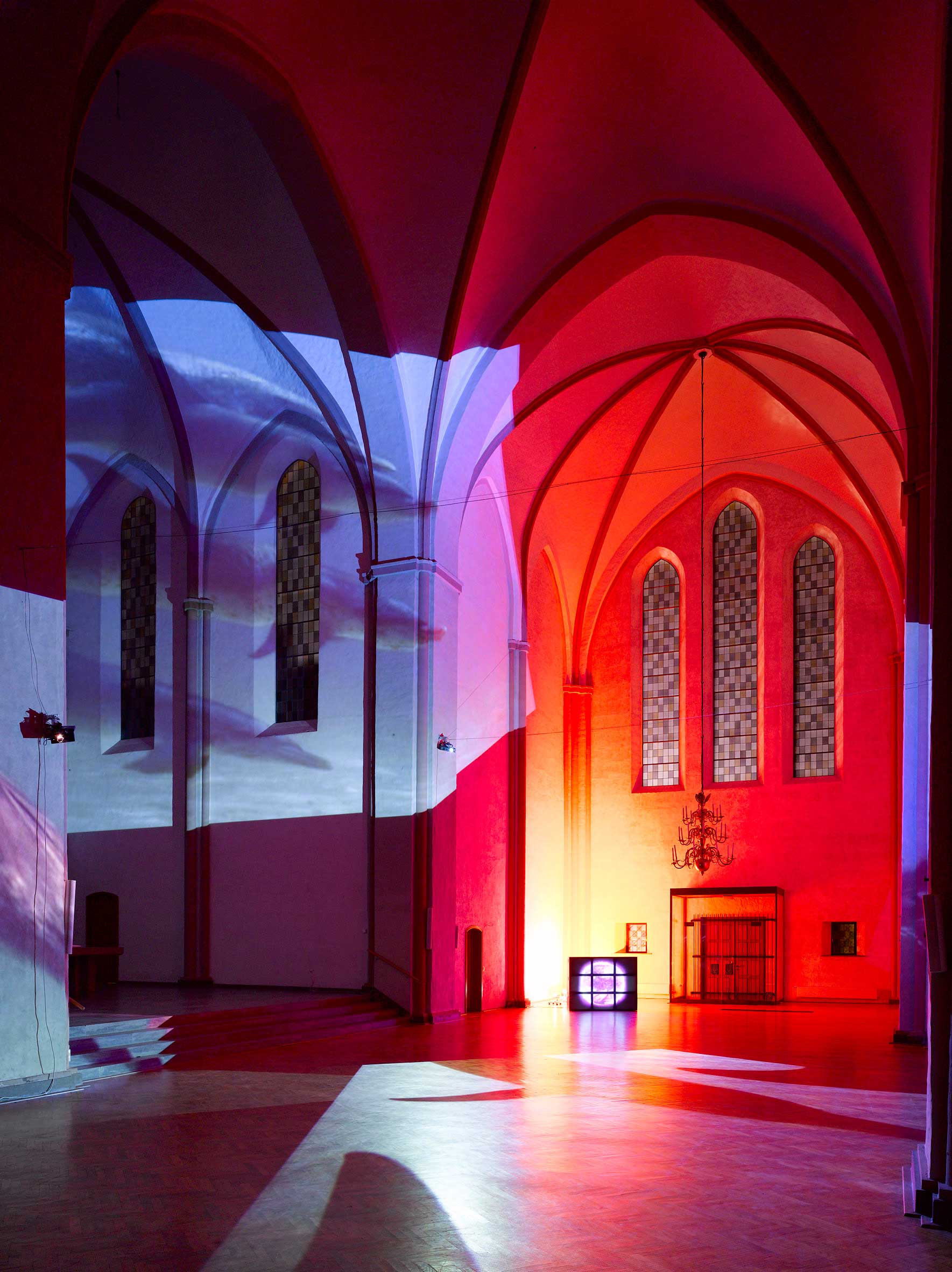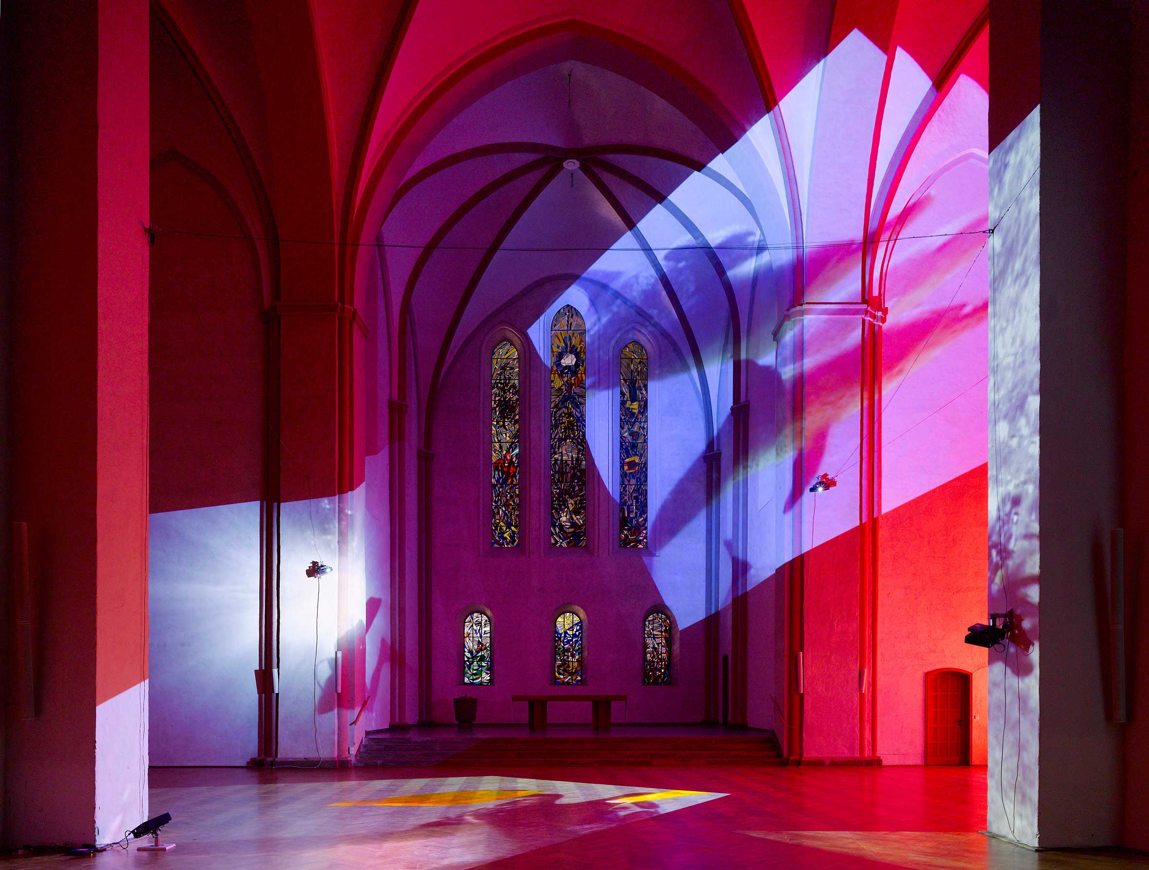 Delphine, 1999 Four (4) video projectors, five (5) media players, nine (9) Video monitors, Lee filters and existing architecture Dimensions Variable Installation view, Los Angeles County Museum of Art, Los Angeles, California, 2015 Photo by Fredrik Nilsen