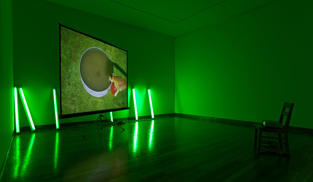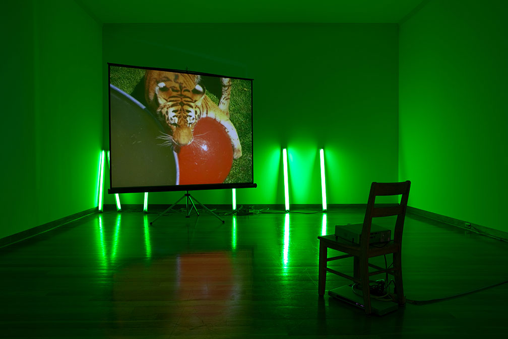 Perfect Devotion Two, 20051 Digital projector, 1 DVD player, 1 Screen on a tripod, 1 Wooden chair, Green gels and existing architectureDimensions variableInstallation View, Haunch of Venison, London, 2005