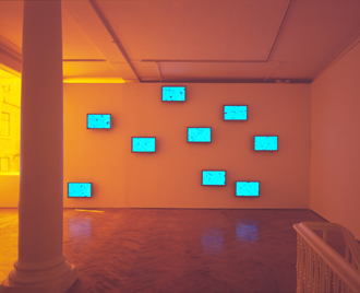 Perpetual Motion Two, 2005Nine (9) flat panel monitors, one (1) distribution amplifier, one (1) DVD player, one (1) DVDDimensions variableInstallation view, The Vanmoerkerke Collection, Oostende, Belgium, 2009
