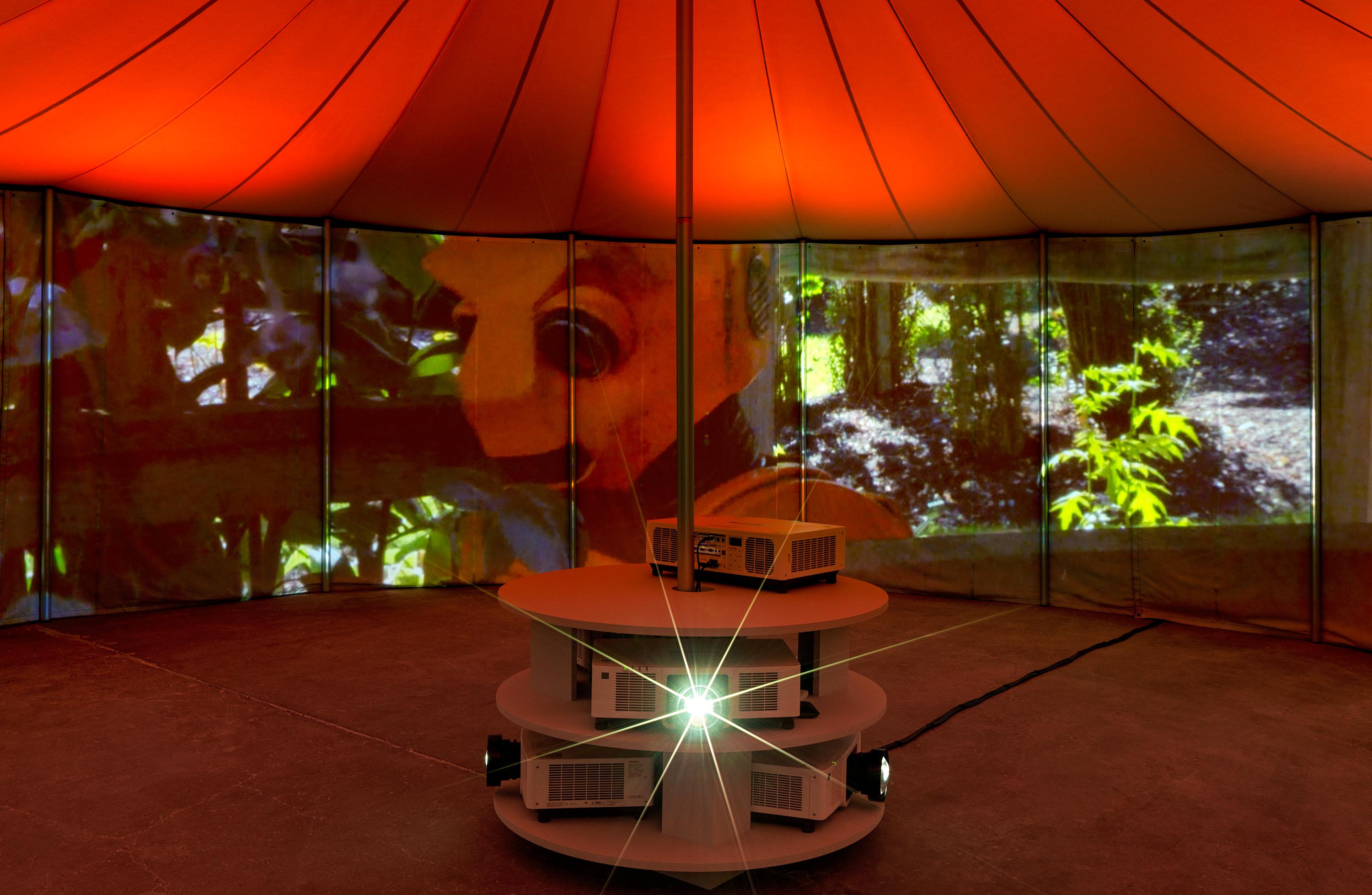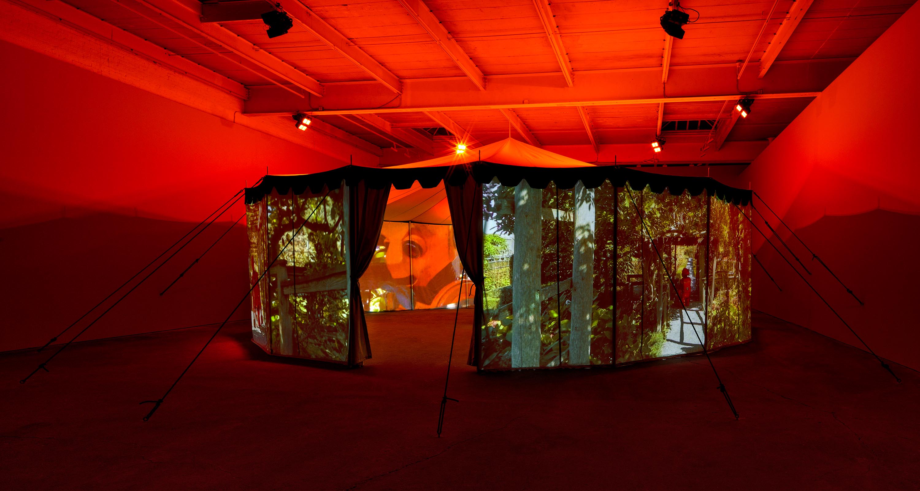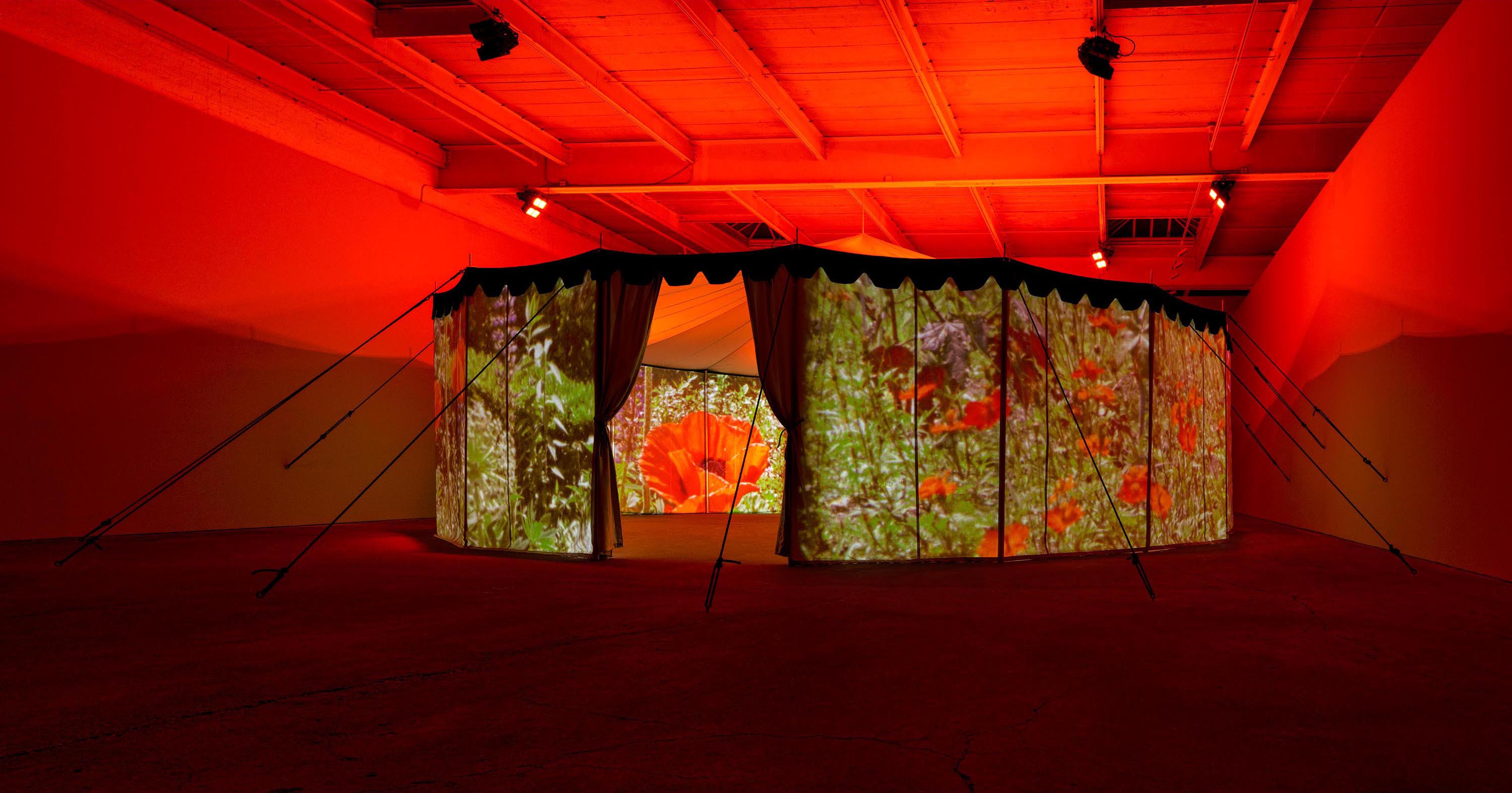 Practical Effects, 2022One (1) tent, five (5) projectors, five (5) media players, and six (6) DMX lightsPhoto by Kerry McFateInstallation view David Zwirner, New York, NY