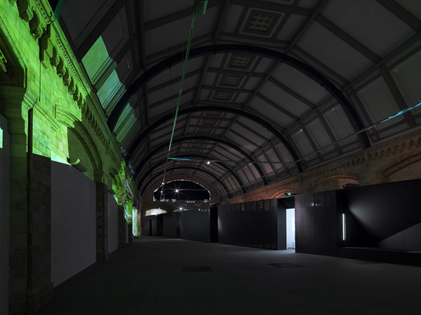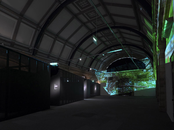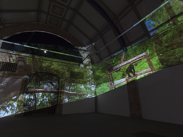gorillagorillagorilla, 2009 6 Video Projectors, 2 Video Monitors, 8 Media Players, Lee Filters and Existing Architecture Installation view, The Natural History Museum, London, England, 2009