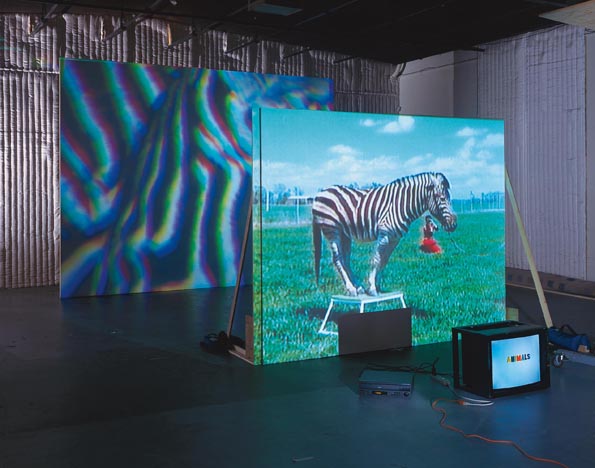 The best animals are the flat animals, 1998 2 Video Projectors, 2 DVD Players, 2 DVDs, Free Standing wall and Existing Architecture Installation View, HZKM Zentrum fur Kunst und Medientechnologie, Karlsruhe, Germany, 2003