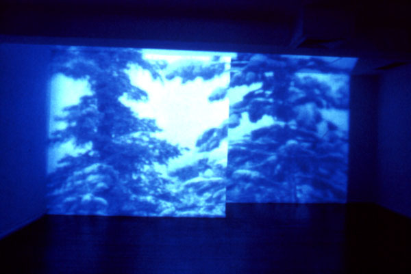 The Bad Infinite, 19933 DVDs, 3 DVD Players, 3 Video Projectors, 1 Synchronizer, Existing ArchitectureInstallation view, Long Beach Museum of Art, 1993